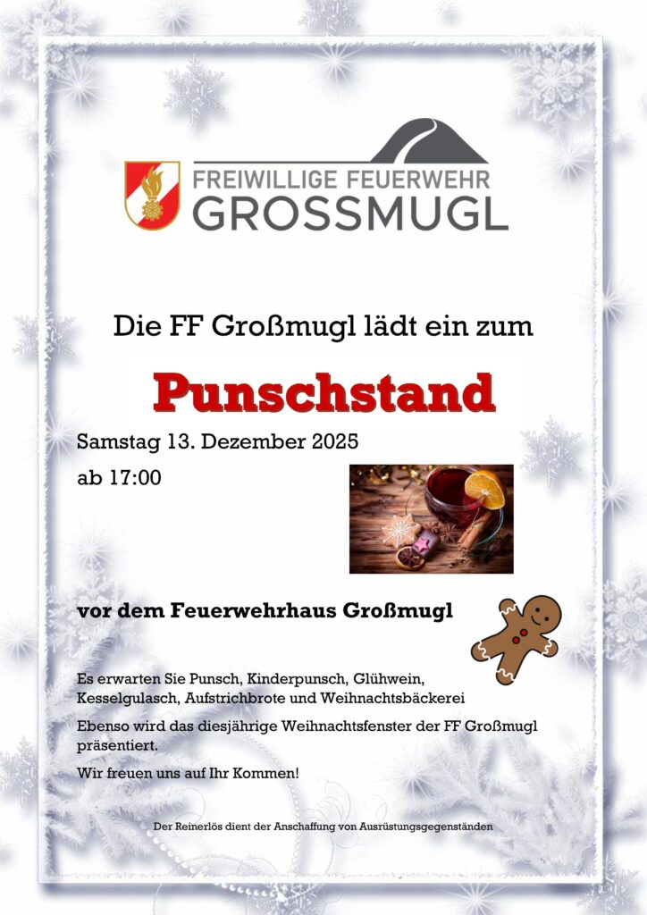 Punschstand der FF Großmugl Von: Christoph Oberschlick 3. November 2025 Wir freuen uns auf euer Kommen beim diesjährigen Punschstand am 13. Dezember ab 17:00 beim FF Haus Großmugl.